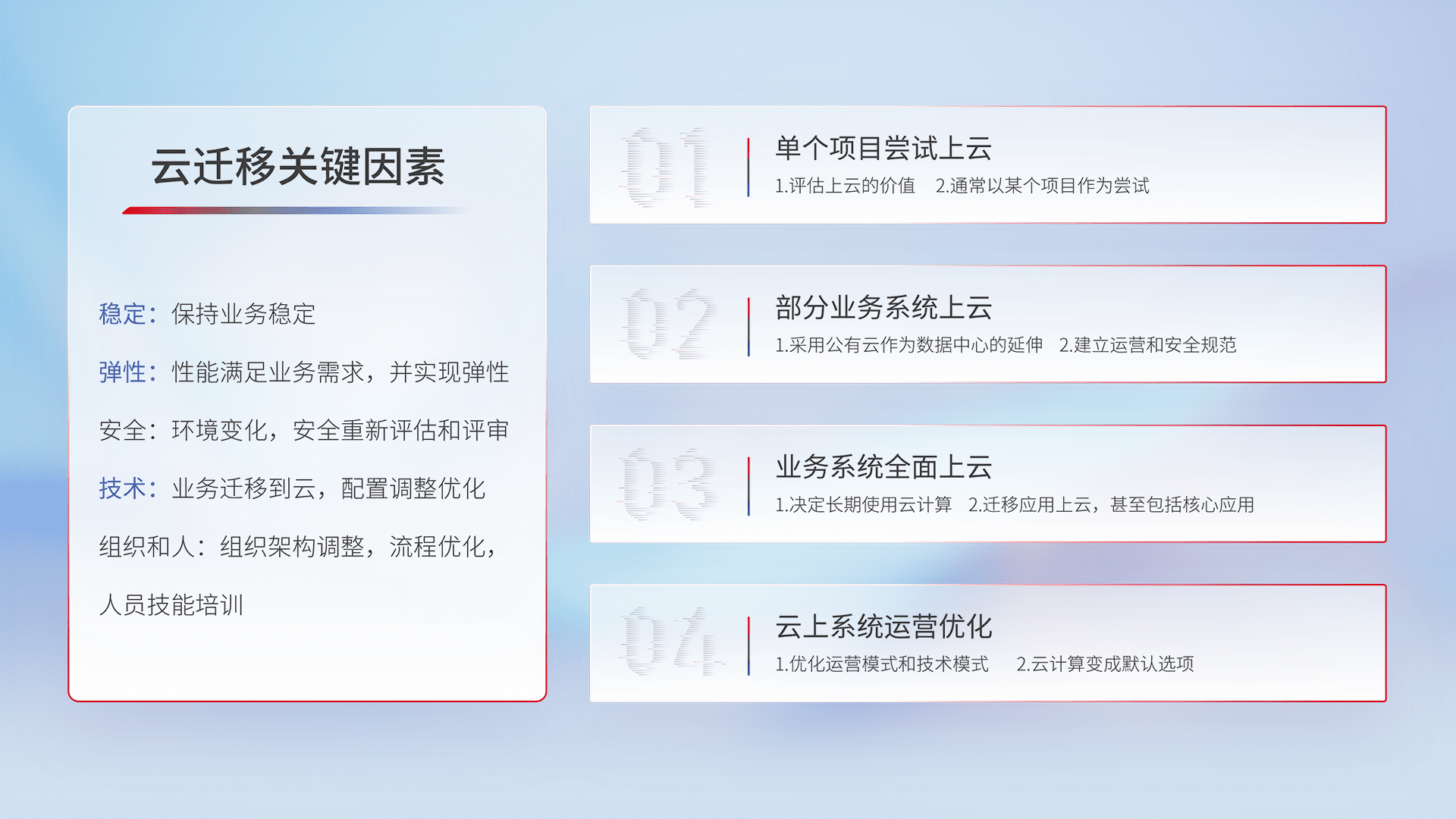 结合实际业务,,,,从规划设计、、云平台选型、、、、云原生改造、、数据迁移、、、、集成交付,,,,迁移全过程为客户识别最佳上云路径,,,,做好风险识别管理,,,,设计网络架构、、身份权限、、、安全审计合规、、、操作审计、、日志审计、、、监控告警策略、、多站点容灾设计等,,对云上基础设施进行整体规划,,,提升IT治理水平,,,以满足弹性、、、高可用、、、、高性能的需求。。。