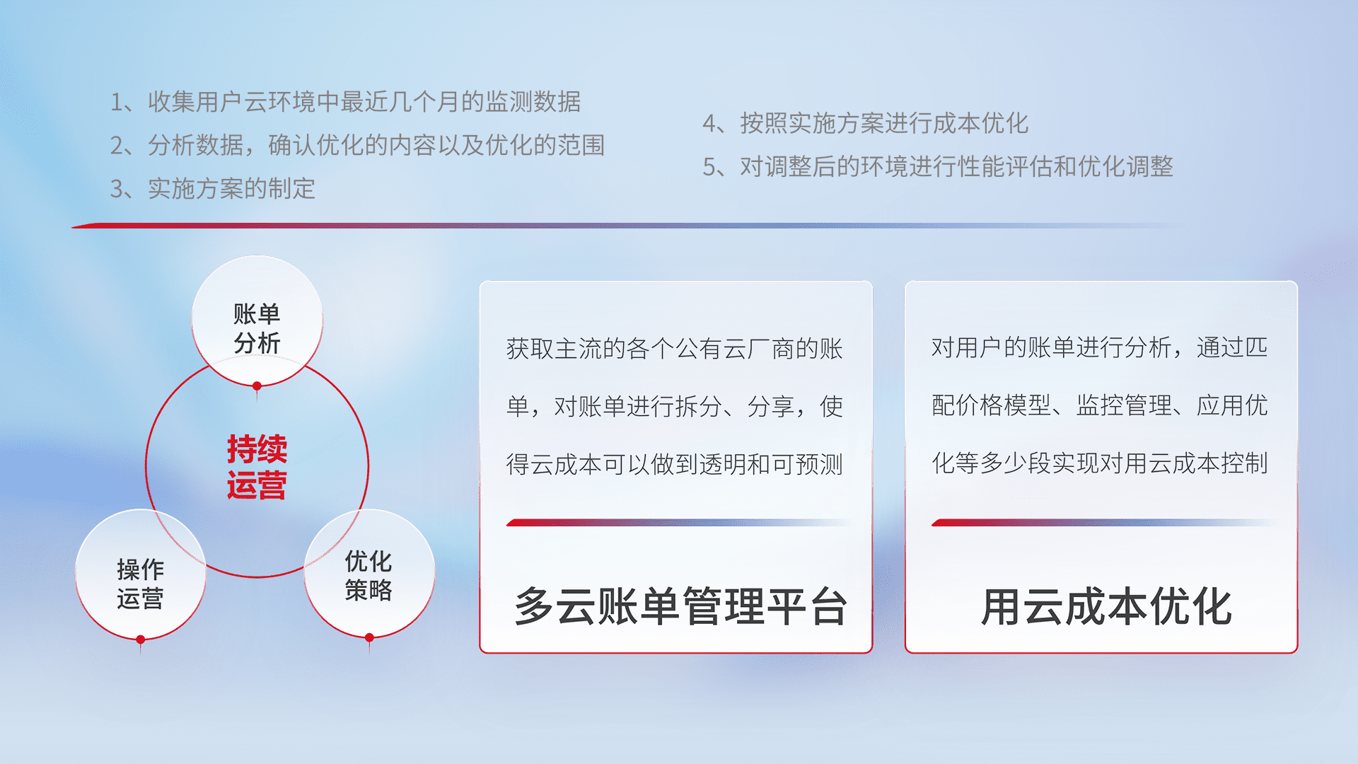 通过多云纳管,,,以统一的资源数据模型把客户的云资源进行抽象和封装,,,,进而实现对多云资源的统一操作,,,保障云资源管理的可靠性、、、、稳定性与可用性。。。量身定制化运维内容,,,配置、、、、开发运维、、、、补丁管理、、、备份、、、监控、、、认证和访问管理、、、、审计和日常巡检等,,,保障在用云过程中的可靠度,,,稳定度以及高可用率。。。